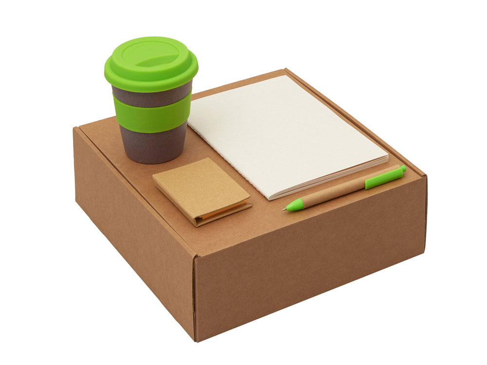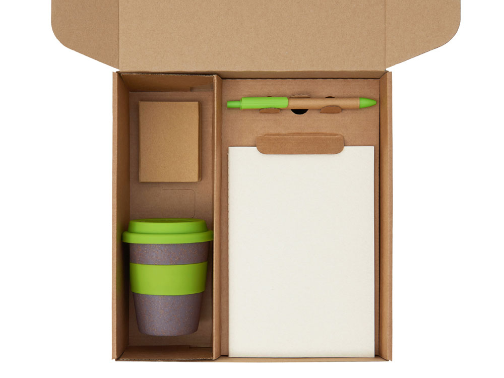 | Материал товара | блокнот- бумага из переработанных тетра-паков, ручка- картон, пластик, стакан- 50% бамбуковое волокно, 50% полипропилен, коробка- картон |