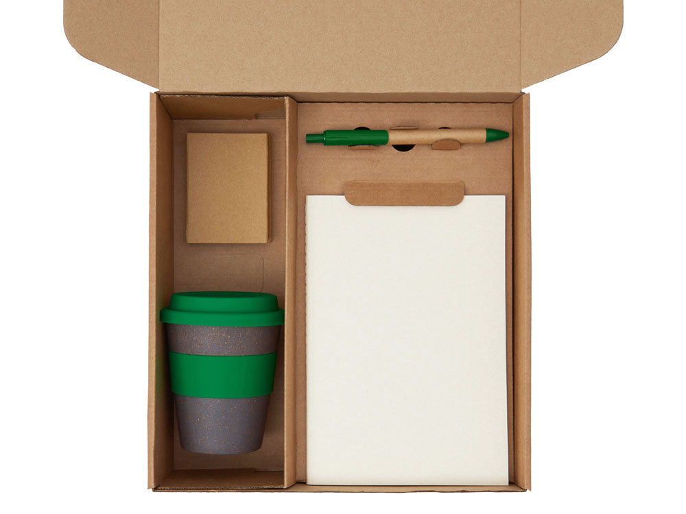| Материал товара | блокнот- бумага из переработанных тетра-паков, ручка- картон, пластик, стакан- 50% бамбуковое волокно, 50% полипропилен, коробка- картон |