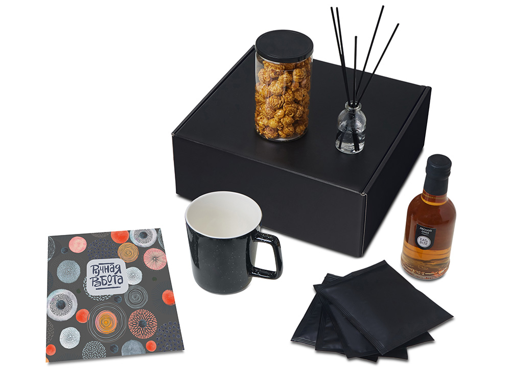 Материал товара диффузор - стекло, кофе в дрип пакете - пластик, кружка - костяной фарфор, попкорн - пластик, металл, мешок - нетканый материал (спанбонд), коробка - картон