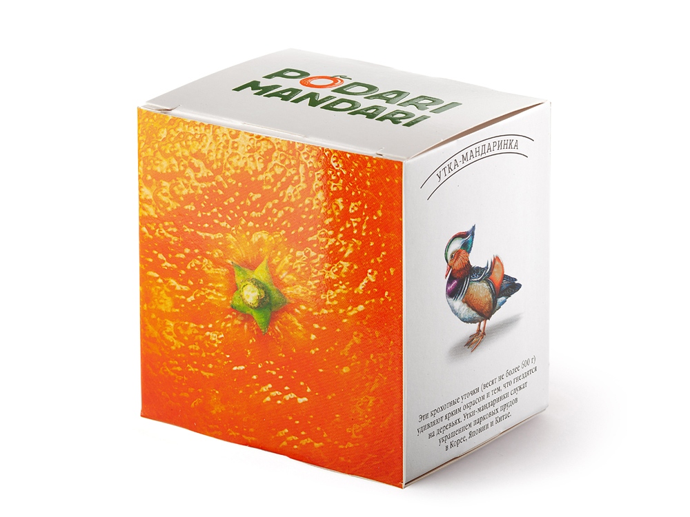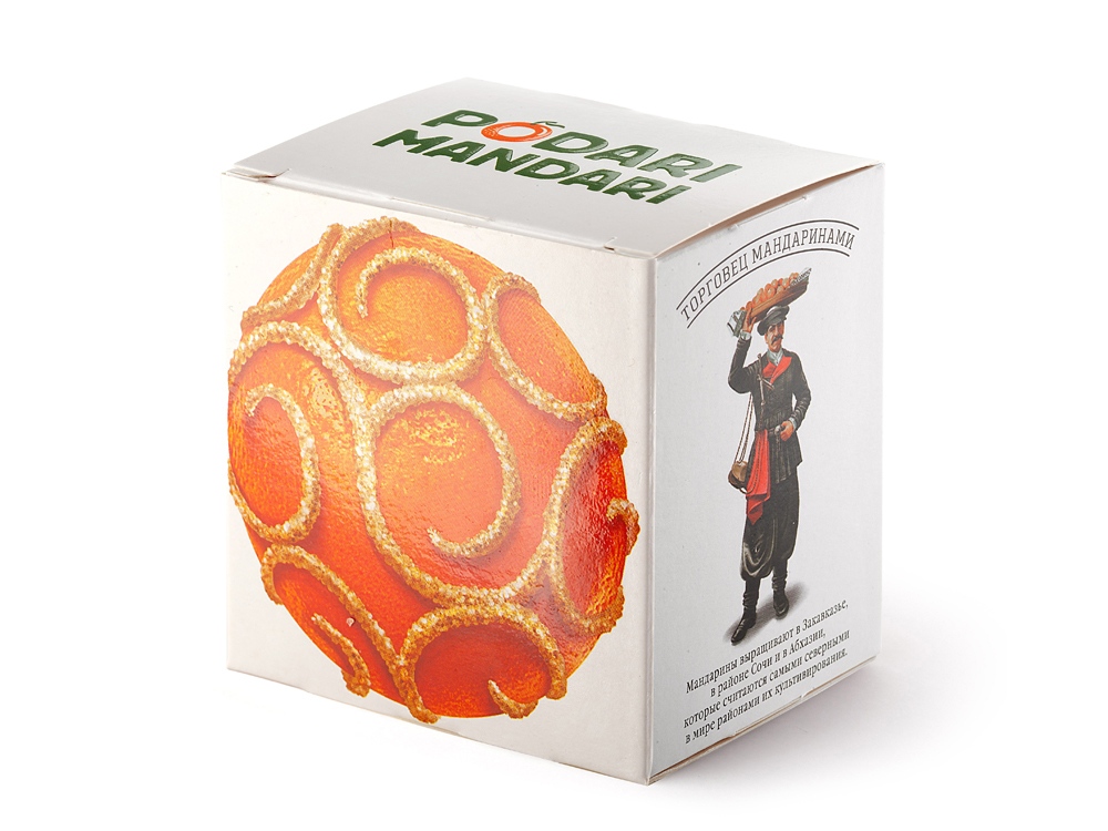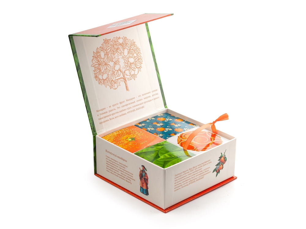 Гастрономический подарочный набор ПодариМандари. Набор представляет собой метафору мандарина – одного из главных символов Нового года. Состоит из 4 продуктов: – чай с цедрой, сегментами и цветами апельсина; – мармелад из мандаринов; – цукаты из кумквата; – цитрусовые леденцы. Продукты упакованы в небольшие картонные коробочки размером 70 х 70 х 55 мм и помещены в шкатулку из переплётного картона с магнитным клапаном. Состав: Кумкват: кумкват, сахар, Е220. Мармелад: сахар, мандариновое пюре, патока, лимонная кислота, пектин. Чай: чай черный байховый, лепестки календулы, ягоды облепихи, имбирь, кусочки апельсина, шелковица. Леденцы: патока, вода, регуляторы кислотности (лимонная кислота, молочная кислота), ароматизаторы, идентичные натуральным, краситель: аннато, сахар.