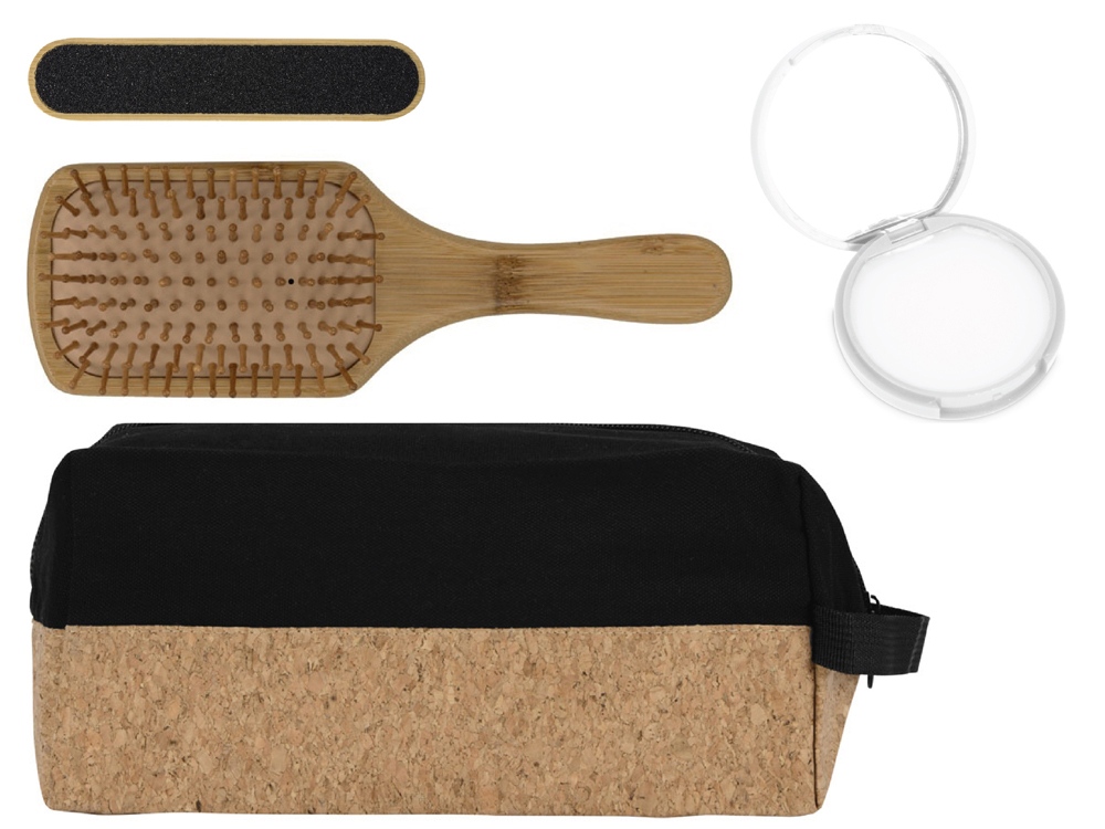 Материал товара расческа, пилка для ногтей - бамбук, бальзам для губ -пластик, несессер - хлопок, пробка, ручка - полиэстер