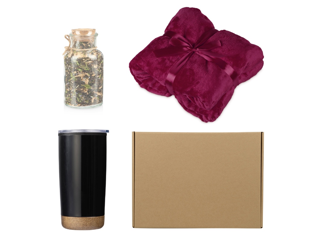 Подарочный набор с пледом, термокружкой и чаем, бордовый