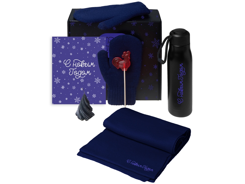 Подарочный набор с варежками, шарфом и термосом, темно-синий