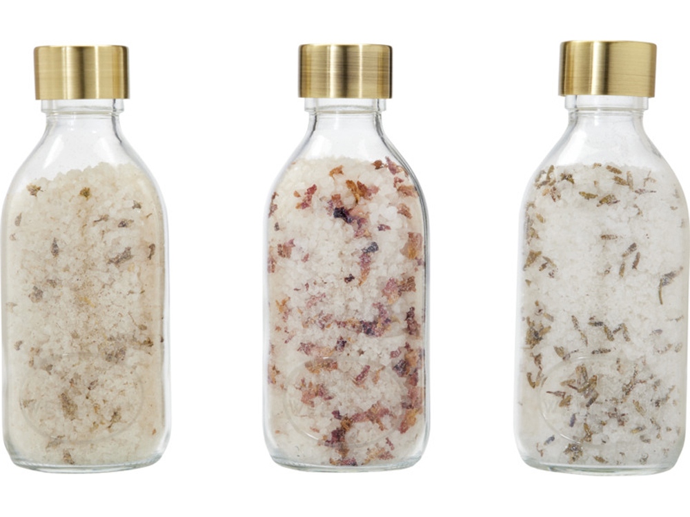 Подарочный набор Just Relax из 3 видов соли для ванны из Мертвого моря объемом 200 мл в бутылках из прозрачного стекла со стальным колпачком, покрытым латунью. В наборе предлагается три популярных аромата: роза, лаванда и ромашка. Не принимаете ванну дома? Соль для ванн также можно использовать для расслабления уставших ног. Набор поставляется в подарочной коробке из крафт картона. Сделано в Нидерландах. Стекло.