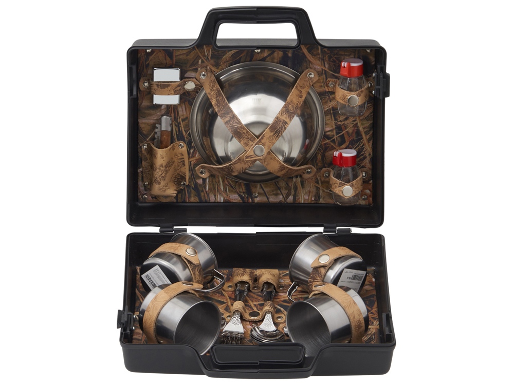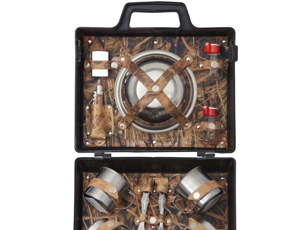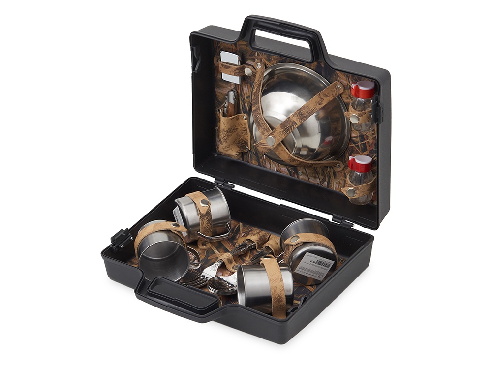 Погрузитесь в атмосферу комфорта и стиля с нашим подарочным набором. Этот тщательно подобранный комплект идеально подходит для тех, кто ценит качество и удобство во время отдыха на природе. В комплекте: - Кружки 200 мл. (нерж. сталь)- 4 шт - Вилки (нерж. сталь)- 4 шт - Ложки (нерж. сталь)- 4 шт - Тарелки 700 мл. (нерж. сталь)- 4 шт - Миска 1000 мл. (нерж. сталь)- 1 шт - Складной нож- 1 шт - Зажигалка- 1 шт. - Емкости для соли и перца- 2 шт. Все аксессуары упакованы в пластиковый кейс и надежно закреплены ремешками из натуральной кожи, что обеспечивает удобство транспортировки и сохранность содержимого. Набор Походный – это идеальный выбор для похода на несколько дней, дружеской встречи или семейного отдыха на природе.