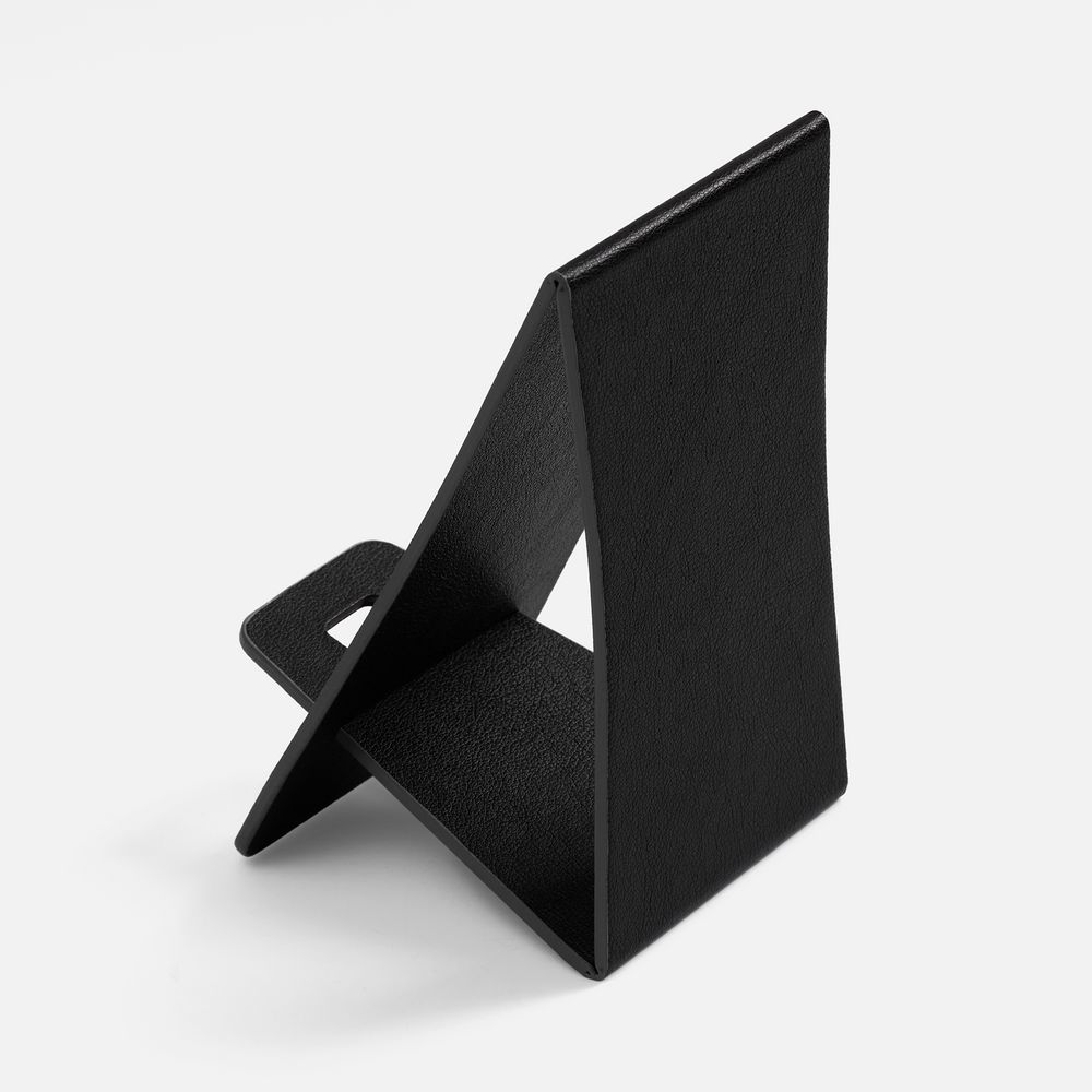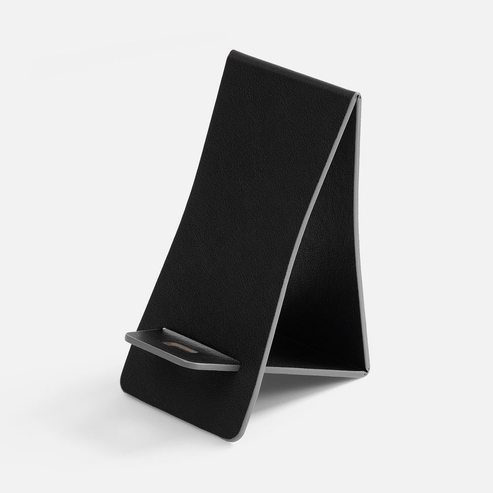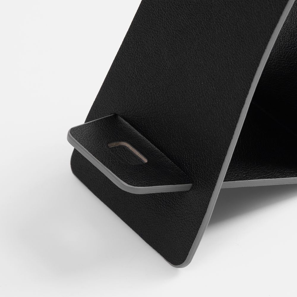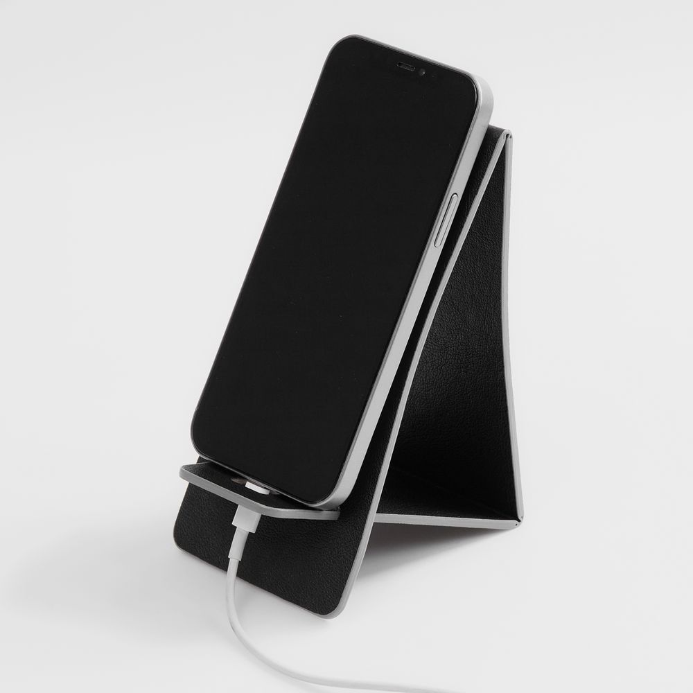 Складная подставка для телефона с вырубкой под шнур зарядного устройства. Выполнена из материала Petrus.
