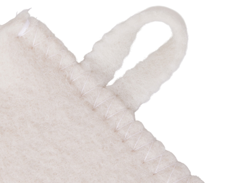 Рукавица для бани и сауны сохранит руки от ожогов при касании печной заслонки или горячего ковша, а также от мозолей при использовании веника. Войлок обладает высокими термоизоляционными свойствами и хорошо впитывает влагу, поэтому наилучшим образом подходит для изготовления банных аксессуаров. • Защищает от ожогов и мозолей • Хорошо впитывает влагу • Быстро сохнет Рекомендуется ручная стирка при 30°C с использованием специальных средств для шерсти или мягкого мыла.