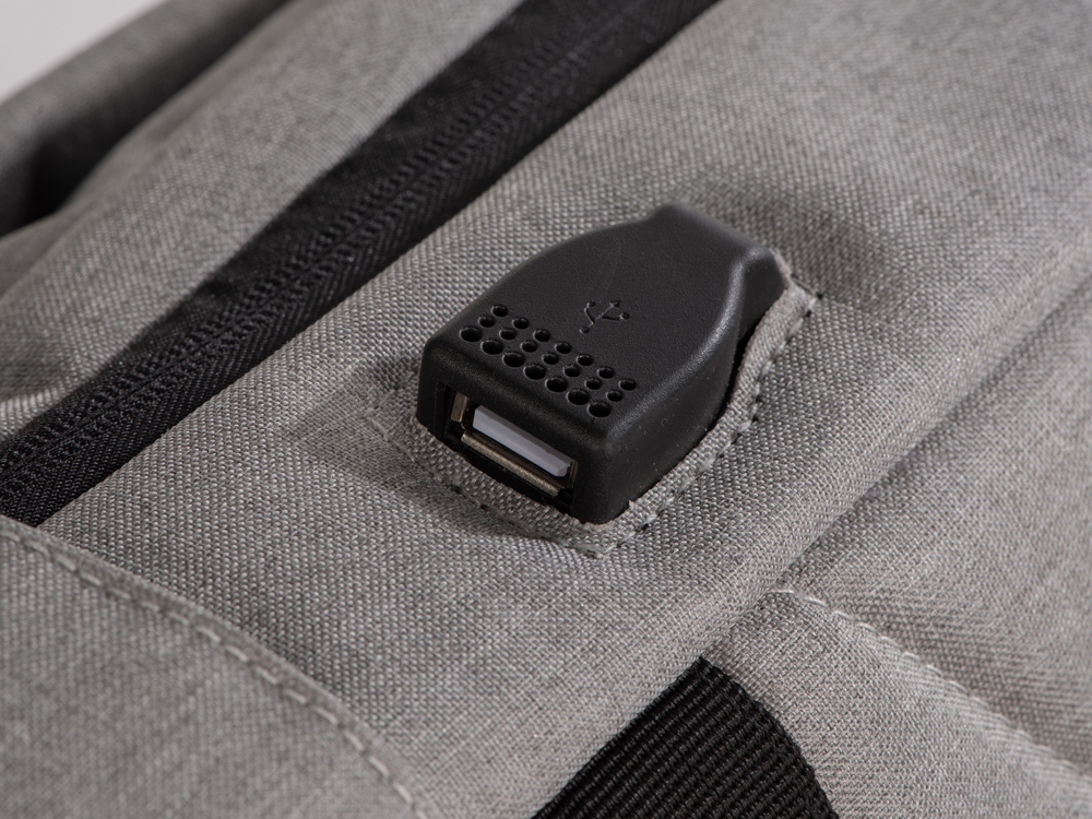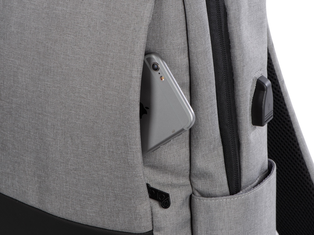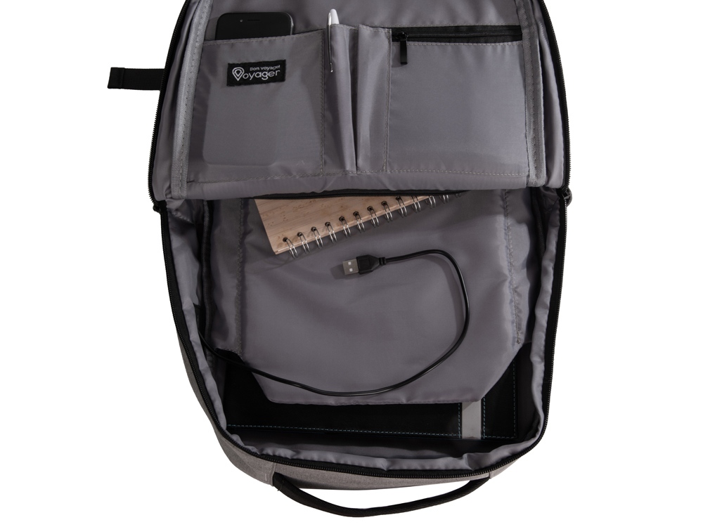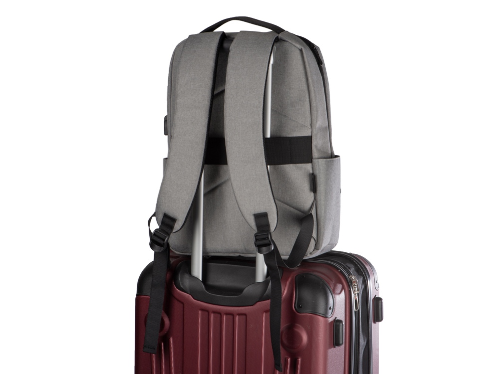 Отличный функциональный бизнес-рюкзак оснащен всем необходимым: - 2 боковых наружных кармана - наружный вертикальный карман - внутри карман для ноутбука 15 - органайзер с карманами на молнии - USB выход - ремень для крепления на чемодан - регулируемые по длине лямки - нетканый мешок для хранения в комплекте Прочный полиэстер устойчив к истиранию, что обеспечивает качество и долговечность рюкзака. А низкая водонепроницаемость убережёт ноутбук и другие важные предметы от намокания. За счёт большого поля для нанесения на лицевой части рюкзака вы можете разместить на нем не только логотип, но и полноценный принт, сделав свой мерч ещё привлекательнее!