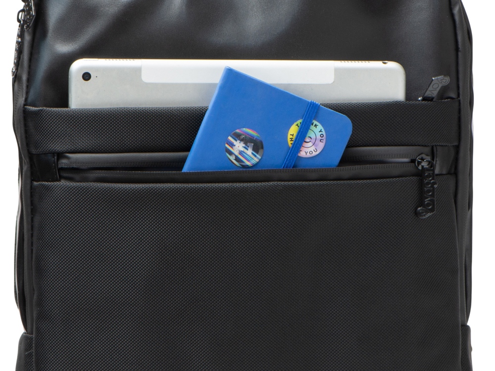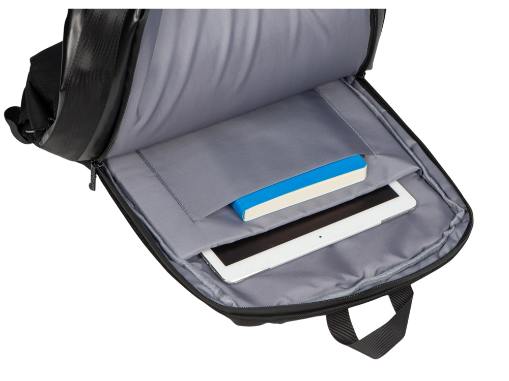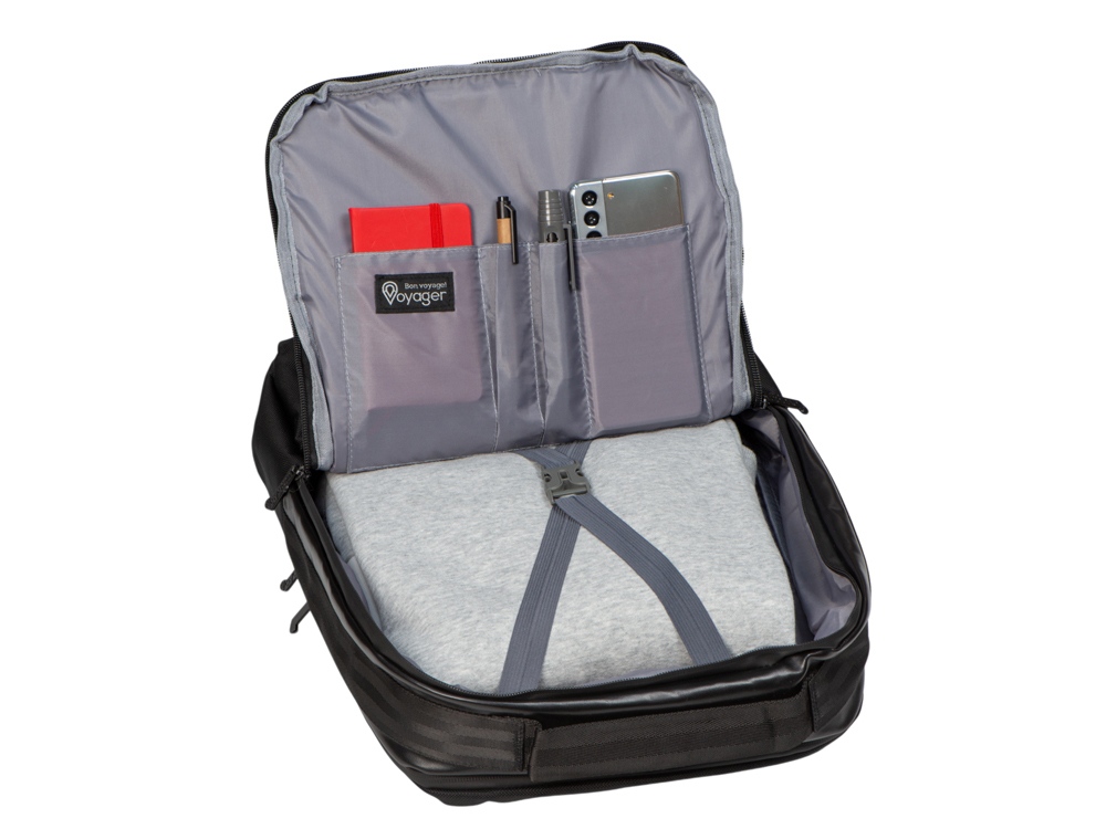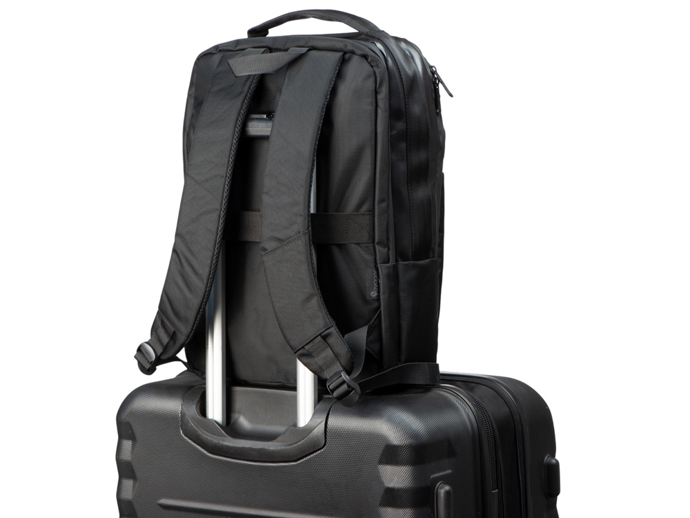 Удобный бизнес-рюкзак для передвижения по городу и деловых поездок состоит из отделения для ноутбука и планшета, большого отделения для одежды с фиксирующими ремнями, 2х наружных карманов на молнии спереди. Конструкция рюкзака продумана до мелочей: внутри большого отделения расположен органайзер для гаджетов и проводов, на спинке есть ремень для крепления на ручку чемодана и регулирующиеся по длине лямки, на лямке - карман для карт или ключей. Водостойкий материал и молнии. В комплекте мешок из спанбонда для хранения и металлический шильд под ваш логотип.