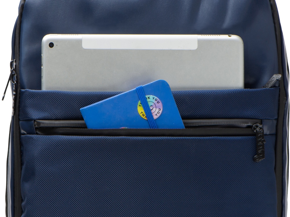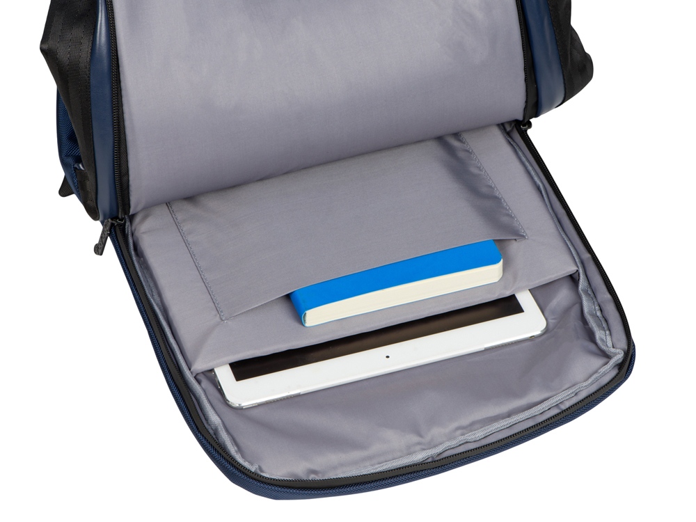 Удобный бизнес-рюкзак для передвижения по городу и деловых поездок состоит из отделения для ноутбука и планшета, большого отделения для одежды с фиксирующими ремнями, 2х наружных карманов на молнии спереди. Конструкция рюкзака продумана до мелочей: внутри большого отделения расположен органайзер для гаджетов и проводов, на спинке есть ремень для крепления на ручку чемодана и регулирующиеся по длине лямки, на лямке - карман для карт или ключей. Водостойкий материал и молнии. В комплекте мешок из спанбонда для хранения и металлический шильд под ваш логотип.