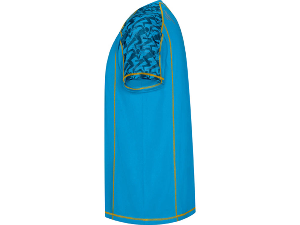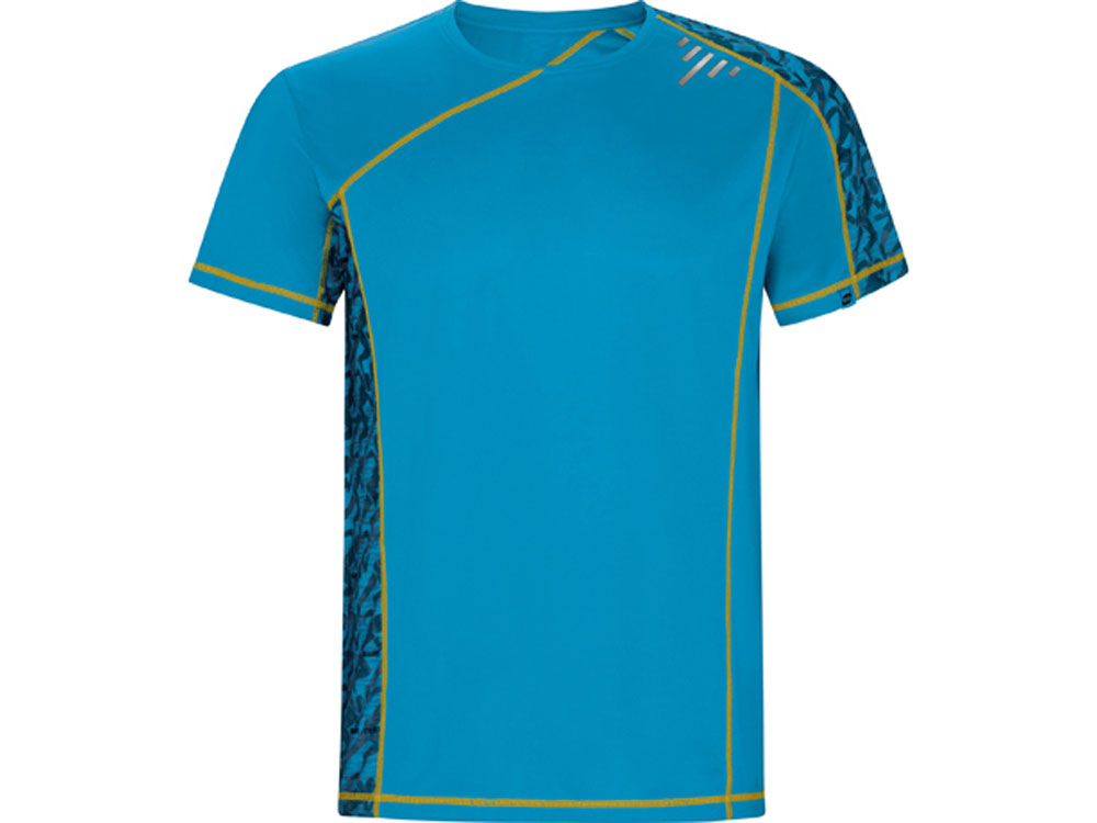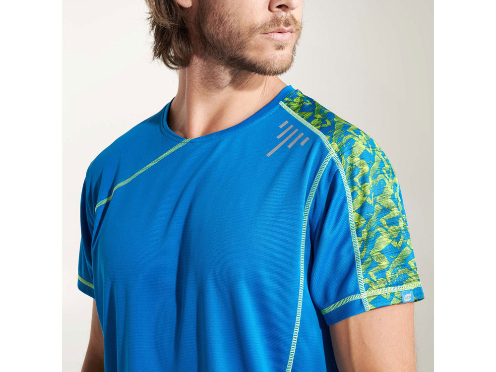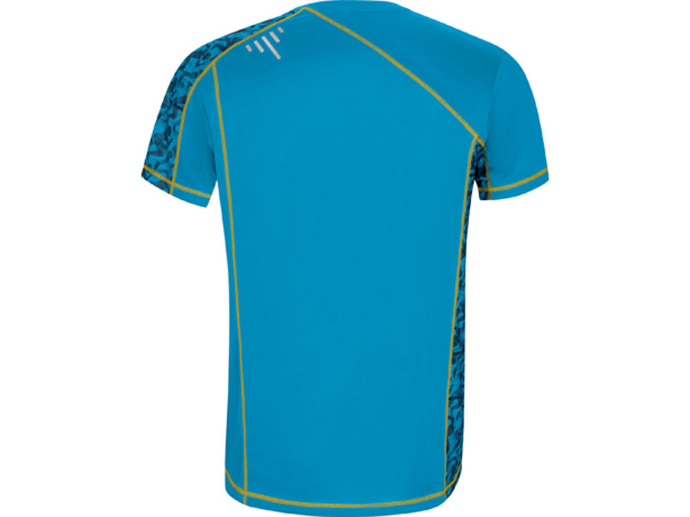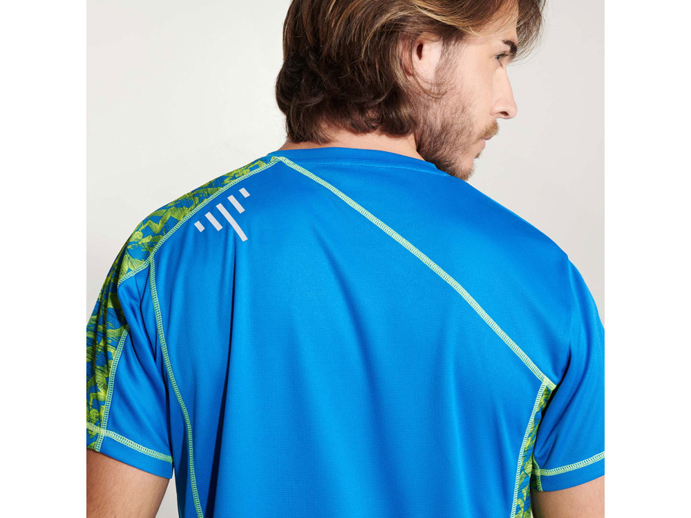 Спортивная футболка с коротким рукавом и принтованными вставками. Контрастные отстрочки плоским швом, светоотражающие элементы на полочке и спинке. Эко лейбл на рукаве. Технологичное полотно: *переработанный полиэстер с функцией контроля сухости *защита от UV излучения