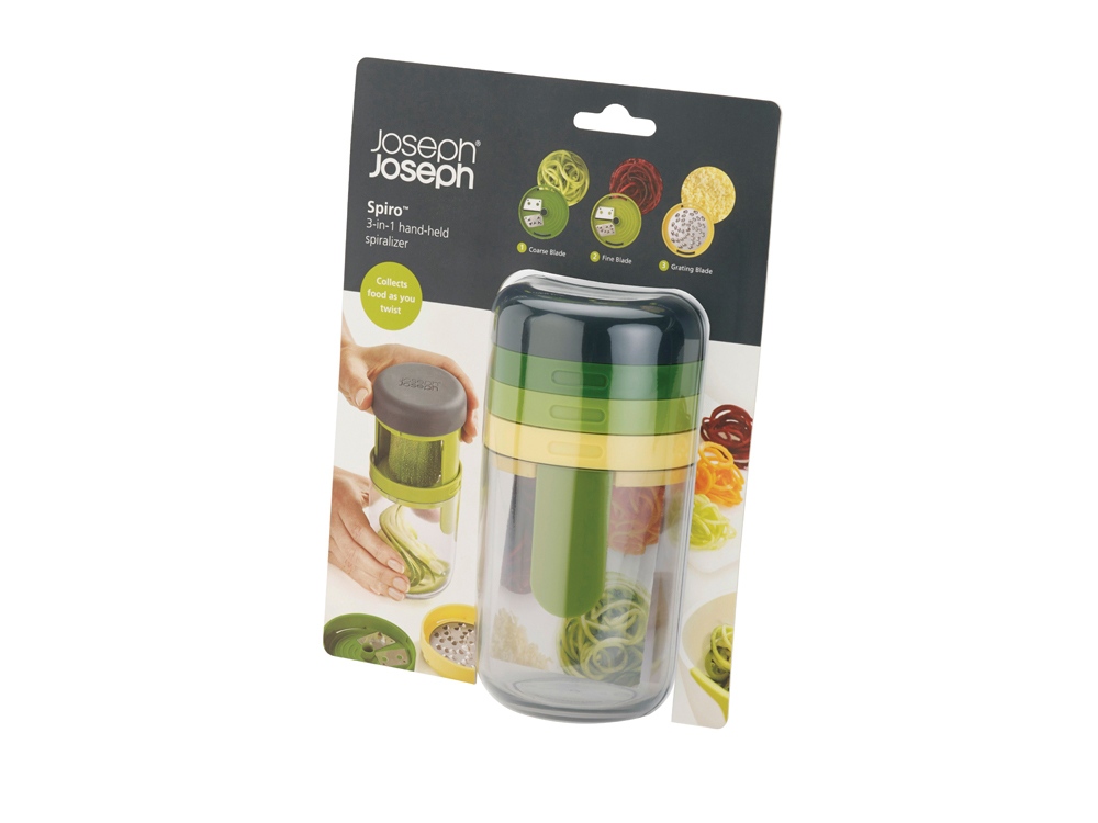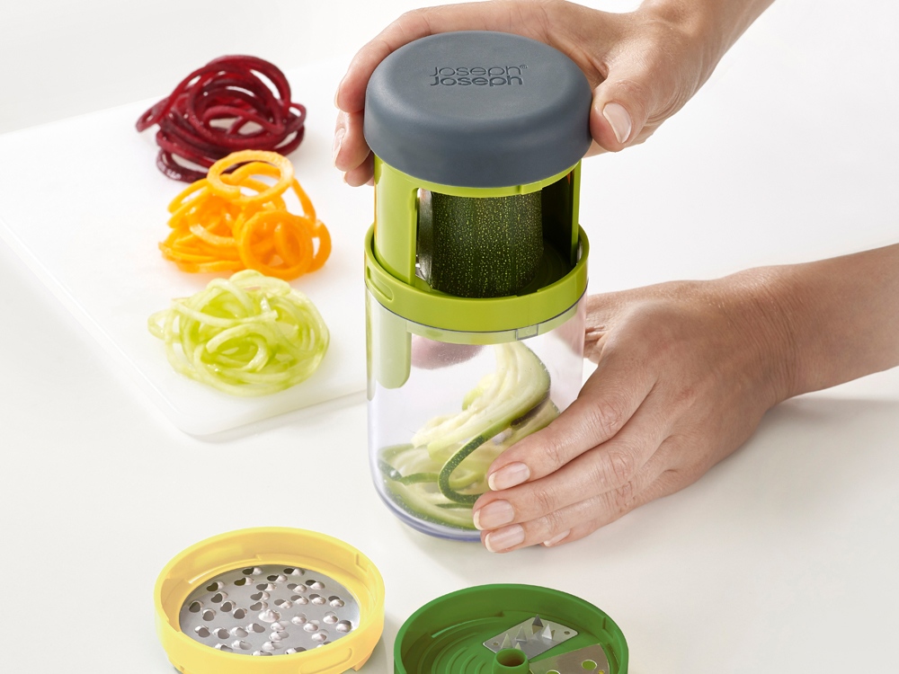 Спиральная терка открывает новые возможности для тех, кто любит готовить. Легкая в использовании конструкция делает длинные ровные полосы из овощей и фруктов. Полученная овощная лапша подходит для украшения праздничных блюд, а также для приготовления различных салатов. В комплект входит крупное и среднее лезвие, насадка для сыра и небольшой контейнер для хранения тертых овощей и фруктов. Все элементы соединяются в одном контейнере и занимают минимум места в ящике стола. Можно мыть в верхней части посудомоечной машины.