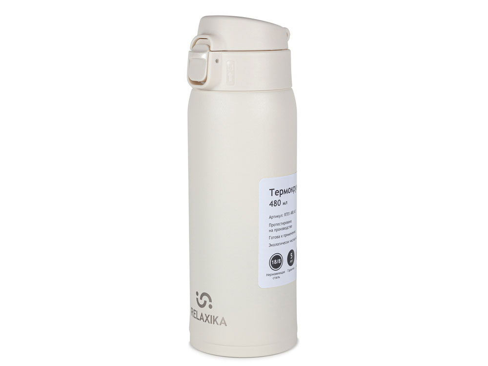Термокружка для кофе и чая Relaxika 0,48 л подходит для ежедневного использования дома, на кухне, на даче, на работе. Компактная и герметичная дорожная кружка 480 мл, благодаря вакуумной изоляции, сохранит ваши напитки горячими или холодными в течение нескольких часов. Удобная и правильная форма для автомобилиста (кружка термос в машину подходит для подстаканника автомобиля). У термокружки есть замок открытия/закрытия. Благодаря такому замку Вы можете использовать кружку Релаксика одной рукой на ходу. Наши термокружки отличаются высокими температурными показателями. Термокружка Релаксика держит тепло до 12 часов: через 3 часа - температура 80,5С. после 6 часов – 70С. через 8 часов - 58,3С. Термокружка автомобильная держит холод до 24 часов.