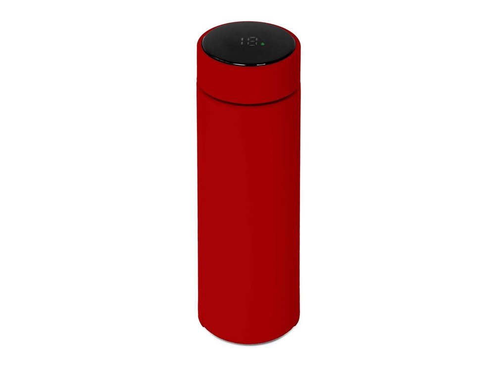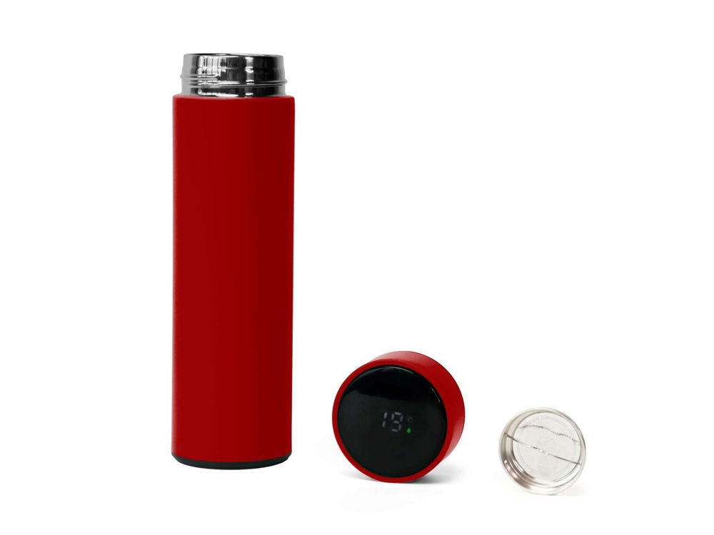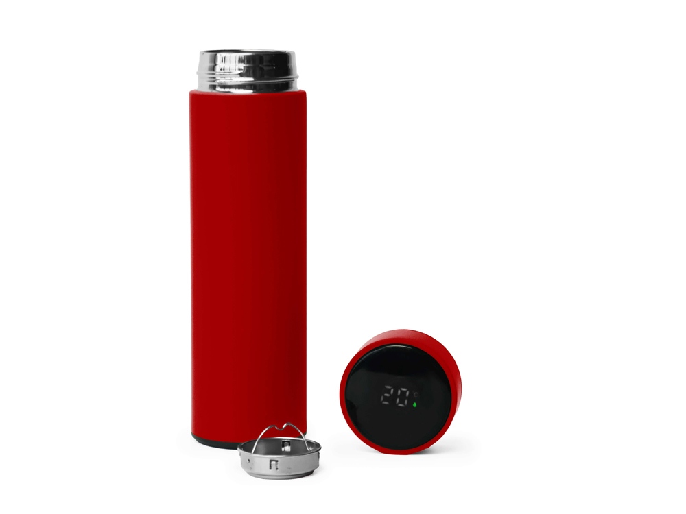 Термос из нержавеющей стали, покрытый цветным soft touch, с крышкой, в которой встроен термометр и LED дисплей, показывающий температуру внутри термоса. Объем: 500 мл. Упаковка: каждый термос в крафт коробке.