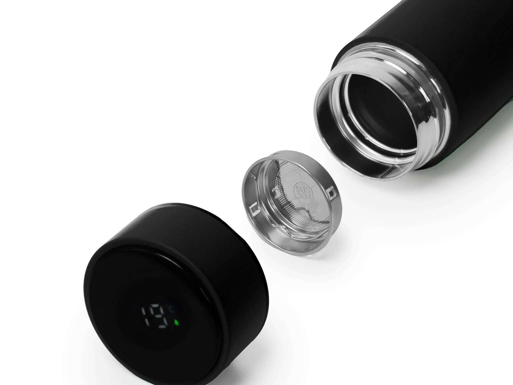 Комплектность термос, датчик температуры в крышке, ситечко, упаковка.