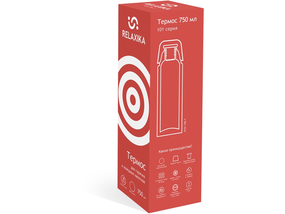 Классический термос Relaxika с высокими показателями удержания температуры напитка для походов, путешествий, спорта и ежедневного использования. Прочные двойные стенки из высококачественной нержавеющей стали 18/8 с вакуумной изоляцией гарантируют, что ваш напиток останется холодным в течение 36 часов и горячим до 30 часов. Этот материал не только прочен, но и гигиеничен, не выделяет никаких вредных для здоровья веществ. Ваши напитки сохраняет естественный вкус и не приобретут посторонний запах. Напиток остается холодным до 36 часов и горячим до 30 часов. - Узкое горлышко позволяет удерживать температуру максимально долго - Крышку термоса можно использовать как чашку BPA Free. В пластмассах, используемых для производства термосов, отсутствует Бисфенол А - Надежная закручивающаяся пробка с силиконовым кольцом защищает от протекания и помогает удерживать температура - Высококачественная нержавеющая сталь 18/8 Рекомендации по уходу Не рекомендуется использовать посудомоечные машины при мытье изделия. Мойте мягкими губками и жидкими моющими средствами. Не используйте сухие абразивные средства чтобы не поцарапать поверхность. После мытья необходимо протереть сухой салфеткой или полотенцем и оставить сушиться без крышки. Не для микроволновой печи или морозильной камеры. Чтобы предотвратить утечку, тщательно закройте верхнюю крышку.