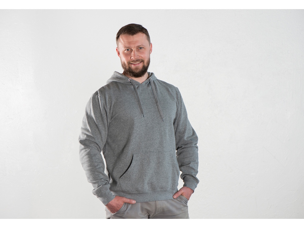 Толстовка с капюшоном (худи) из плотного футера с мягким начесом, с небольшим добавлением полиэстера. Удобная и практичная модель, подходит для прогулок по городу, активного отдыха, путешествий. • Прямой силуэт. • Капюшон с подкладкой в цвет основного материала, металлическими люверсами и плоским шнурком с наконечниками. • Удобный карман-кенгуру. • Долго сохраняет форму и не мнется благодаря небольшому содержанию полиэстера. • Гигроскопичное волокно, обладает хорошими гигиеническими свойствами. • Низ толстовки, рукавов и горловины обработаны рибом (резинкой) 1x1.