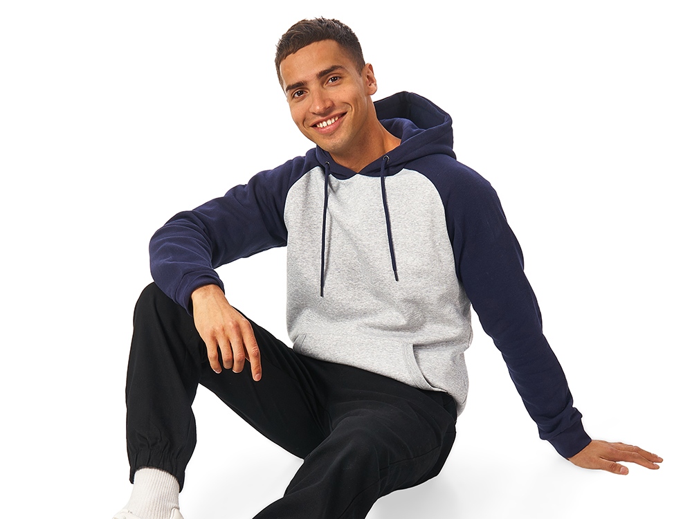 Толстовка с капюшоном (худи) из плотного футера с мягким начесом внутри. Модная и практичная модель, подходит для прогулок по городу, активного отдыха, путешествий и, конечно, промо мероприятий. - Прямой силуэт. - Контрастный рукав реглан и капюшон. - Капюшон с подкладкой из основного материала с металлическими люверсами, круглым шнуром с металлическими наконечниками. - Удобный карман-кенгуру, край отделан рибом 1х1. - Низ толстовки и манжеты рукавов обработаны рибом 1x1. - Полотно с небольшим содержанием полиэстера долго сохраняет форму и не мнется.