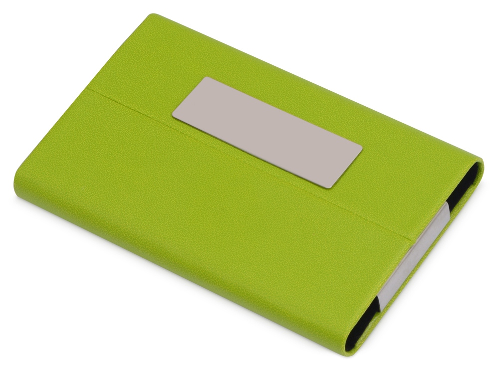 Компактная и легкая визитница выполнена в сочных цветах. Логотип можно нанести на металлическом шильде или на поверхности из искусственной кожи. Вмещает примерно 20 визиток.