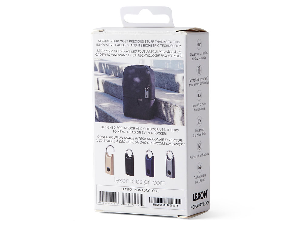 Nomaday Lock — это биометрический навесной замок с функцией распознавания отпечатков пальцев, разработанный для защиты ваших самых ценных вещей. Благодаря технологии распознавания отпечатков пальцев он может хранить до 10 различных отпечатков пальцев и разблокируется менее чем за 0,5 секунды. Замок Nomaday Lock изготовлен из цинкового сплава и оснащен сверхпрочной дужкой из нержавеющей стали, что обеспечивает оптимальную безопасность. Благодаря степени защиты от дождя IP65 его можно использовать как в помещении, так и на улице, что делает его идеальным для защиты ваших ключей, чемодана или шкафчика. Замок заряжается всего за 1,5 часа с помощью входящего в комплект кабеля USB-C и может разблокироваться до 3000 раз, а также может работать в режиме ожидания до 12 месяцев.