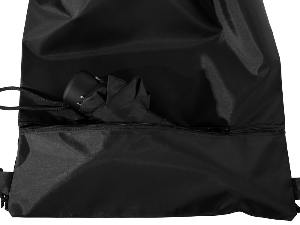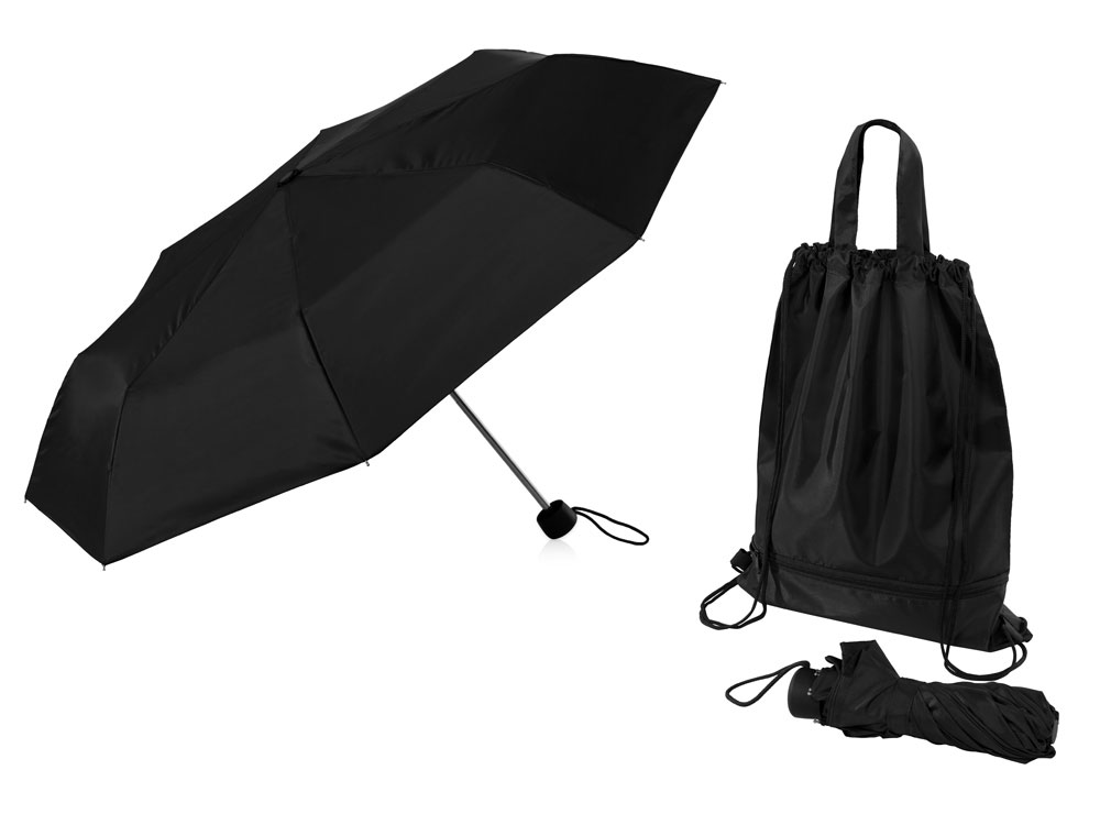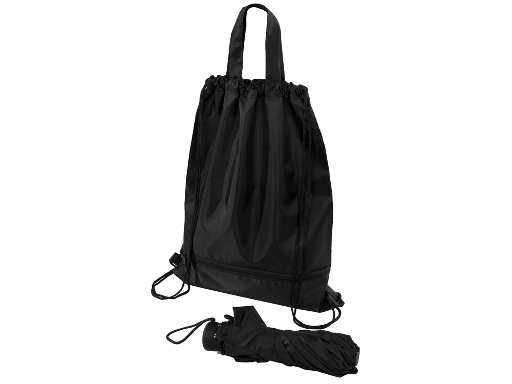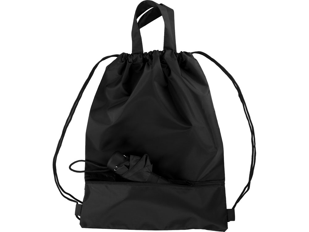 Механический зонт с прорезиненной ручкой идет в комплекте с сумочкой для покупок. На дне сумочки предусмотрен карман на молнии, в котором вы можете хранить зонт дома или прятать в него мокрый зонт, когда вы попали под дождь. Находясь в кармане сумочки, мокрый зонт не доставит неудобств. Сумочка имеет 2 варианта использования: шопер с двумя 2 ручками и рюкзак-мешок со шнурками.