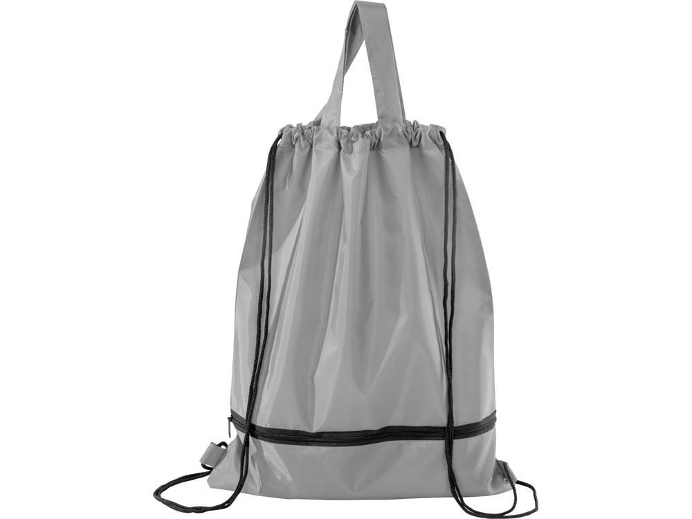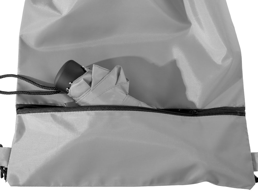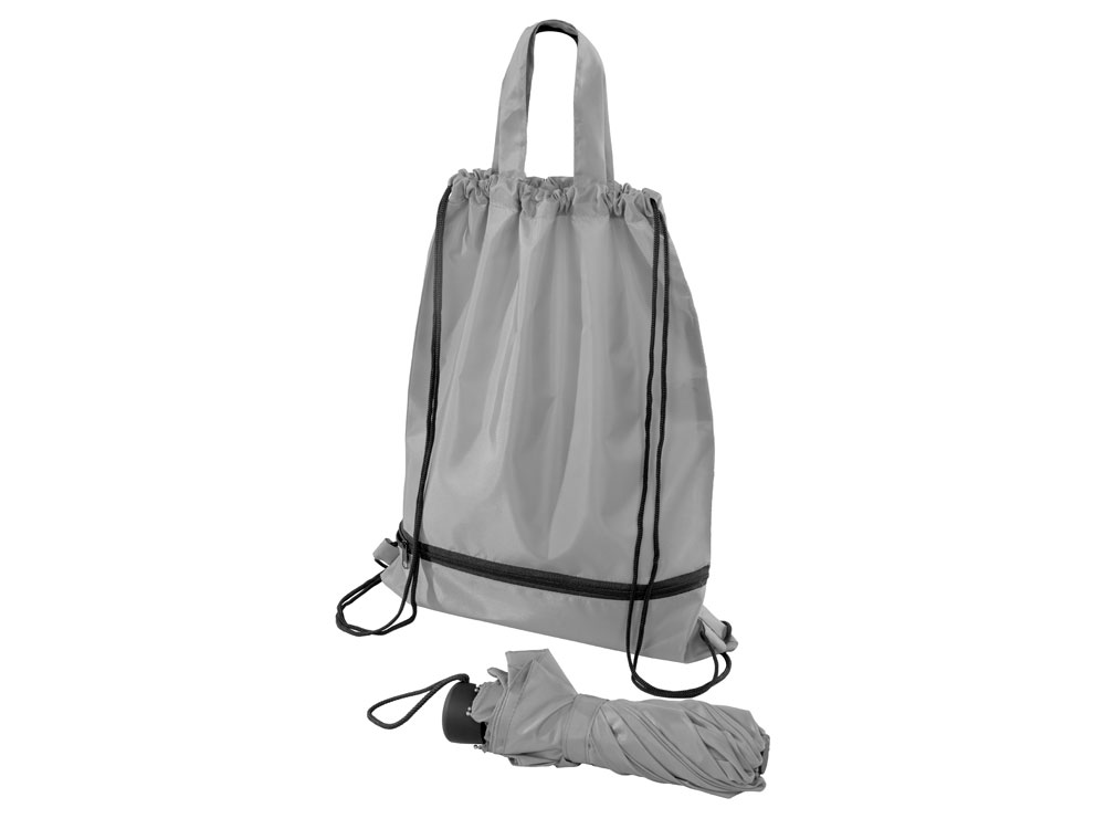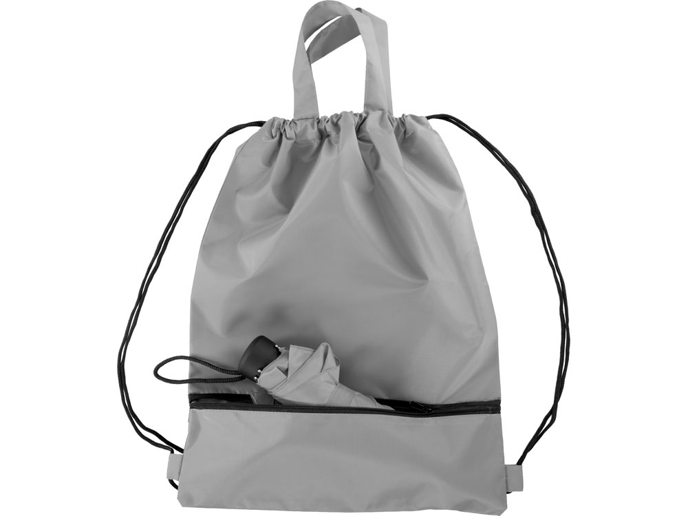 Механический зонт с прорезиненной ручкой идет в комплекте с сумочкой для покупок. На дне сумочки предусмотрен карман на молнии, в котором вы можете хранить зонт дома или прятать в него мокрый зонт, когда вы попали под дождь. Находясь в кармане сумочки, мокрый зонт не доставит неудобств. Сумочка имеет 2 варианта использования: шопер с двумя 2 ручками и рюкзак-мешок со шнурками.