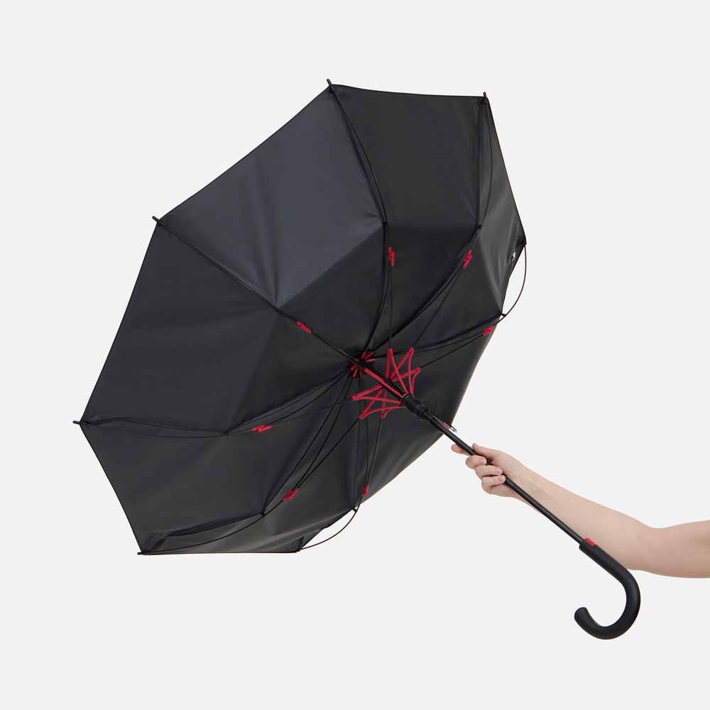 Легкий и невероятно прочный каркас из стеклопластика не боится порывов ветра. Сдержанный дизайн оживляет яркая деталь: цветные акценты на каркасе видны только при раскрытии зонта.