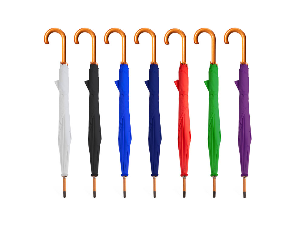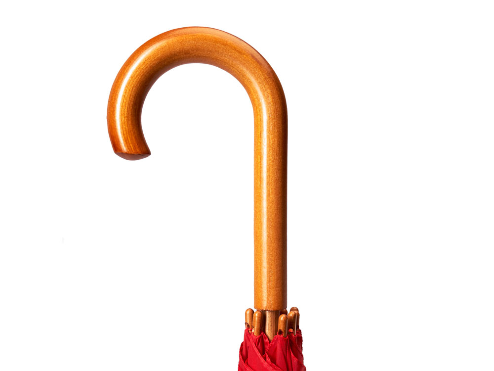 Механический зонт с ручкой, стержнем и наконечниками из дерева. Спицы черного цвета. Застежка-липучка в тон. 105 см в диаметре.