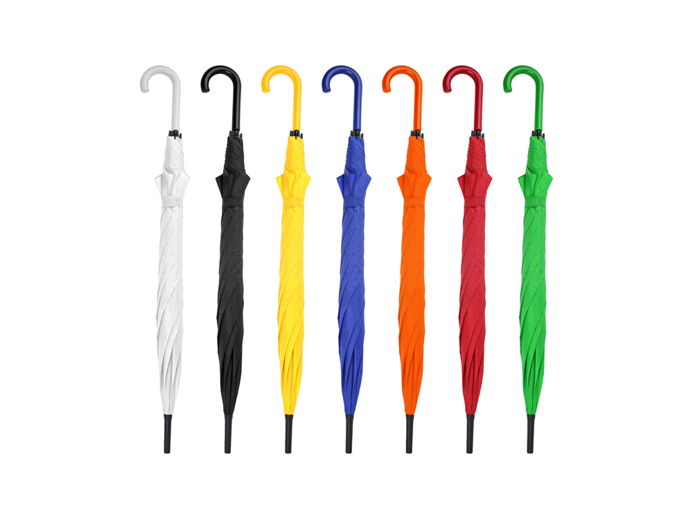 Автоматический зонт с тканью и ручкой в тон. Спицы и наконечники черного цвета. Застежка на липучке. 105 см в диаметре.